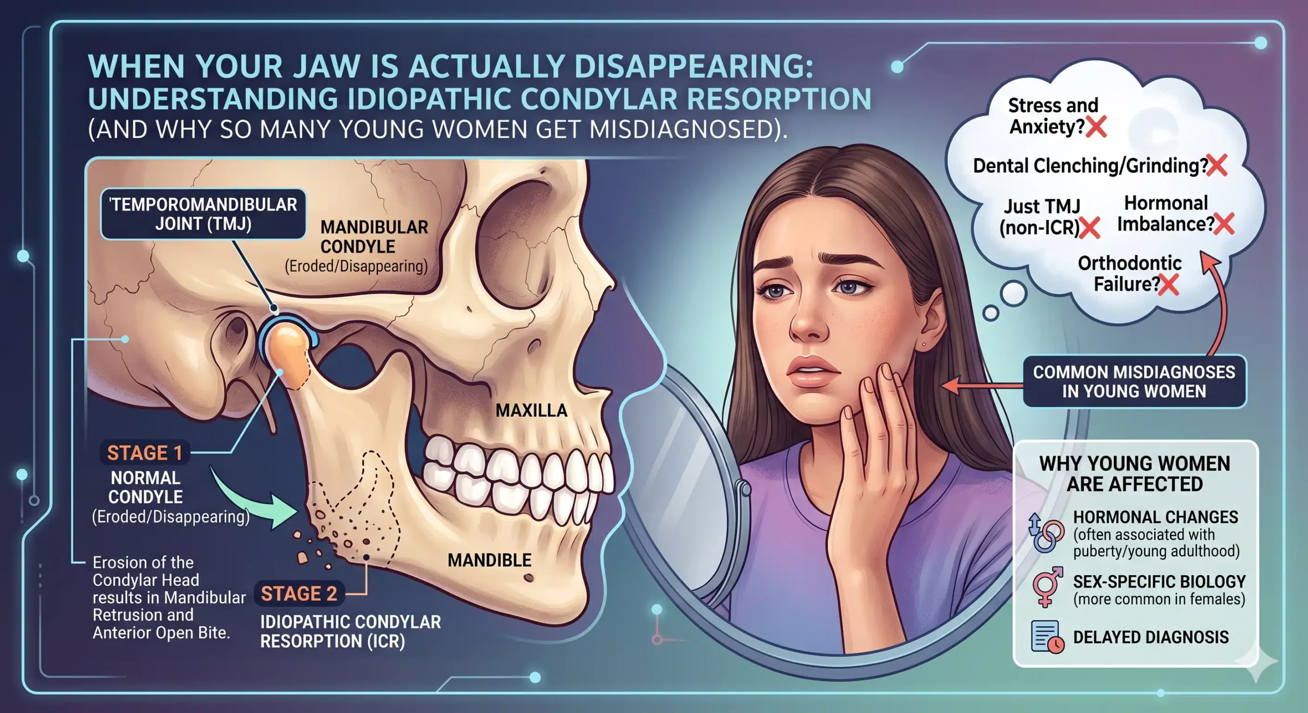 Idiopathic condylar resorption is one of the most under-recognized TMJ diseases in medicine. It almost exclusively affects young women. It progresses silently, often hiding behind what looks like a common orthodontic problem. And it responds beautifully to the right treatment — if it’s caught early enough.
